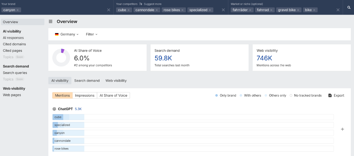 Mit dem neuen Interface, das seit August verfügbar ist, hat ahrefs den Fokus stärker auf die Wettbewerbsanalyse gelegt. Aus unserer Sicht liegt die Stärke klar im direkten Vergleich und in der realistischen Darstellung von AI-Antworten. Die Schwäche: Die Menge der erfassten Erwähnungen ist immer noch zu gering, um eine valide Marktgröße abzubilden.