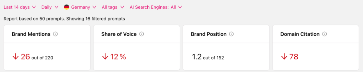 - Brand Report mit Mentions, Share of Voice, Top Prompts, Domain Rank