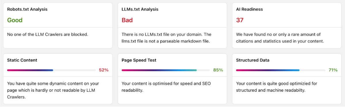 Otterly.ai hat uns vor allem mit seinem GEO Audit überzeugt – die automatischen Prüfungen des Static Content Anteils, der Structured Data Nutzung oder der robots.txt liefern einen ersten schnellen Eindruck zur technischen AI-Readiness einer Website. Auch die detaillierten Auswertungen im Prompt Monitoring sind hilfreich.