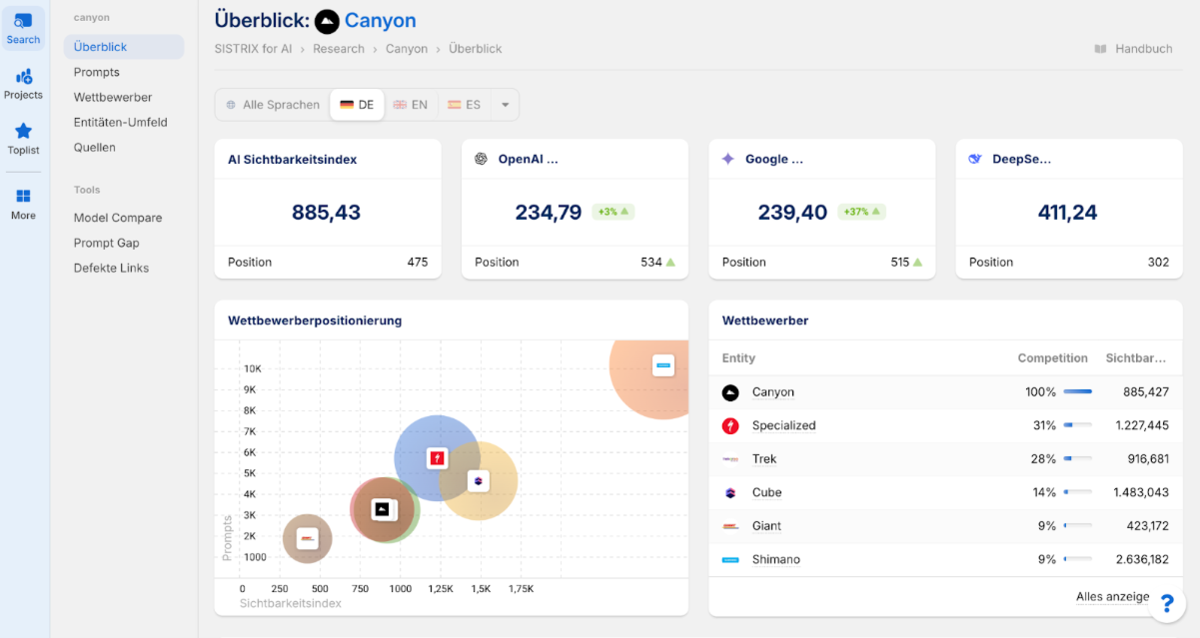 Sistrix hat uns mit seinen umfangreichen Filtermöglichkeiten überzeugt: Prompts lassen sich nach Marke, Modell oder Themenfeld eingrenzen, ohne dass man selbst eigene Prompts hochladen muss. Besonders nützlich fanden wir die Gap-Analyse im Wettbewerbsvergleich und die Entitäten-Analyse, die das thematische Umfeld einer Marke beleuchtet.