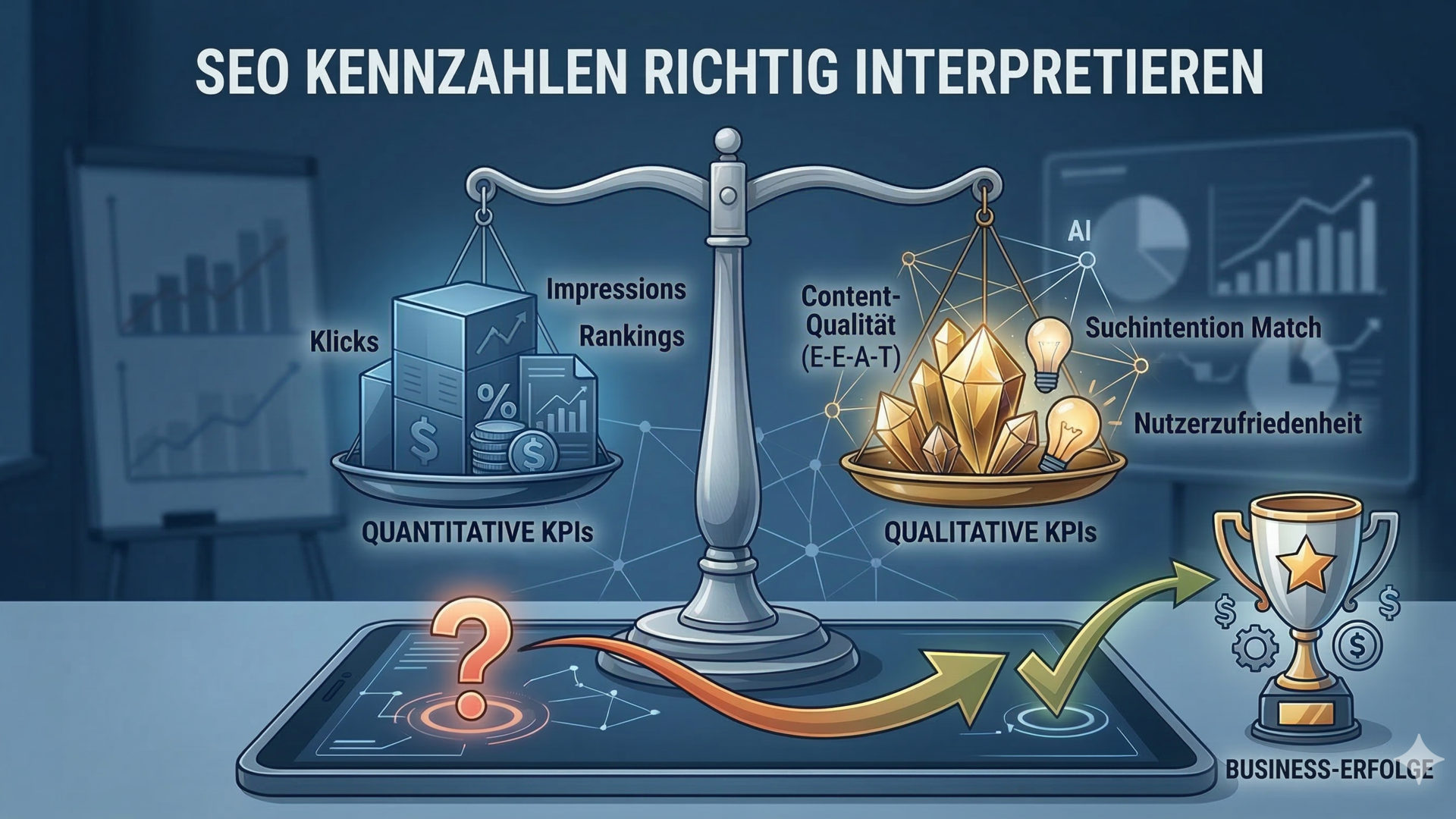 - Qualitative Kennzahlen: Diese bewerten die Güte und Relevanz. Sie beantworten die Frage: „Wie gut?“ (Nutzerzufriedenheit, Suchintention-Match, E-E-A-T).